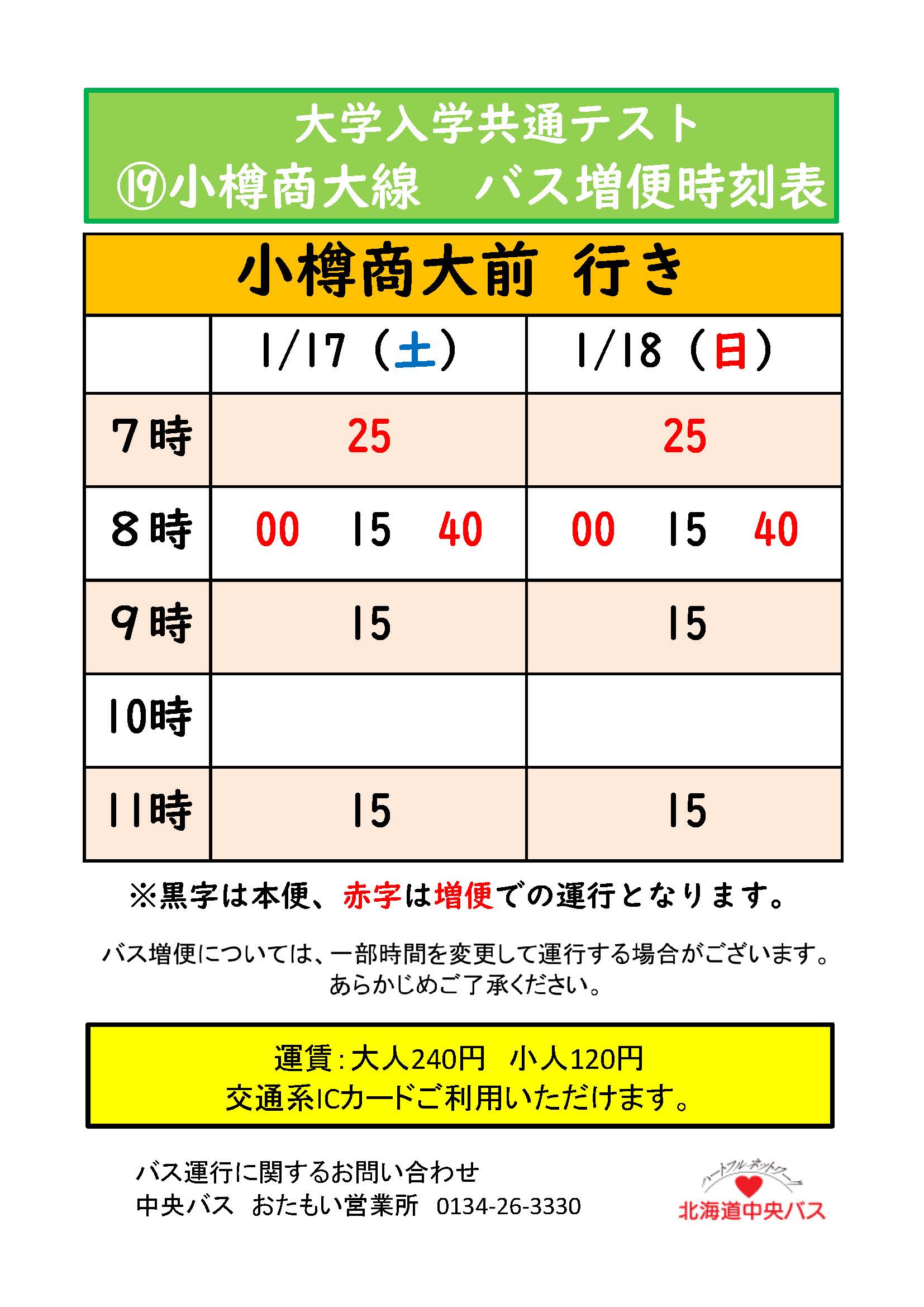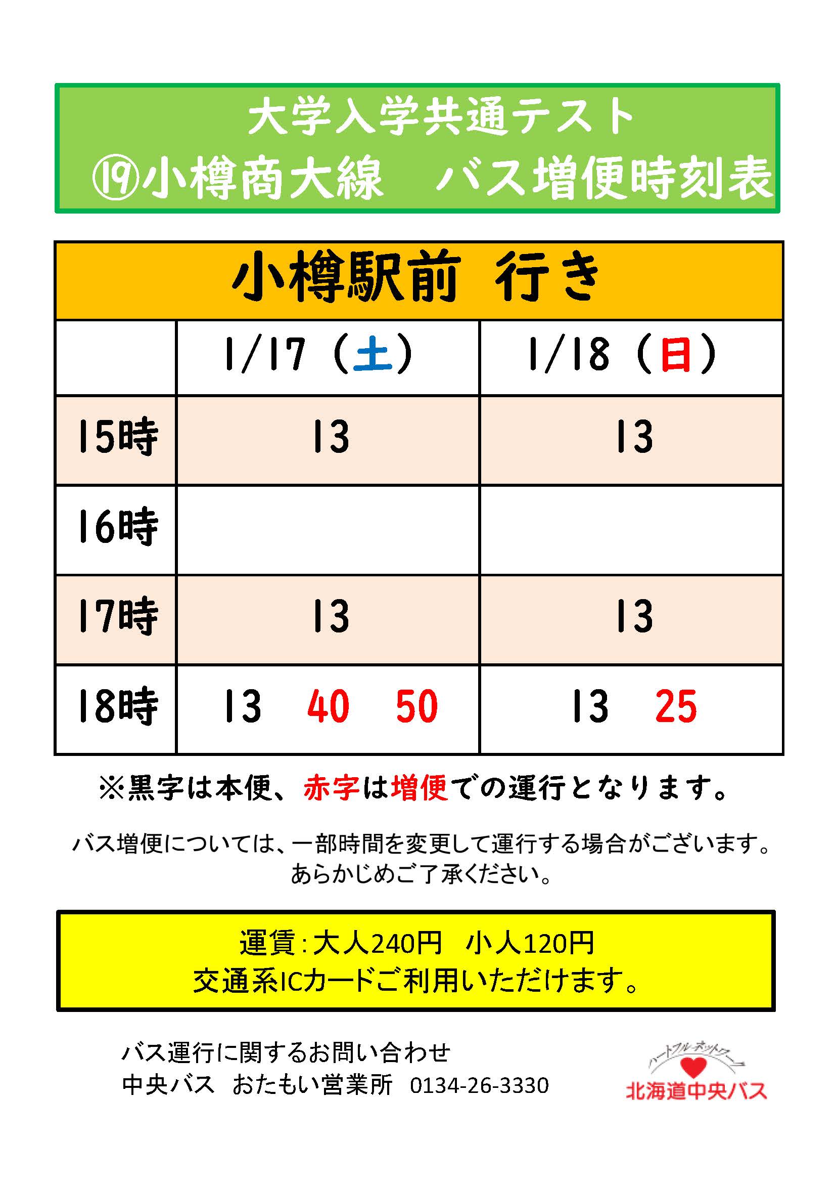 小樽駅より本学までは、JR小樽駅前のJRバス2番乗り場から、中央バス「小樽商大線」にお乗りください。 バスの時刻表は下記のとおりです。