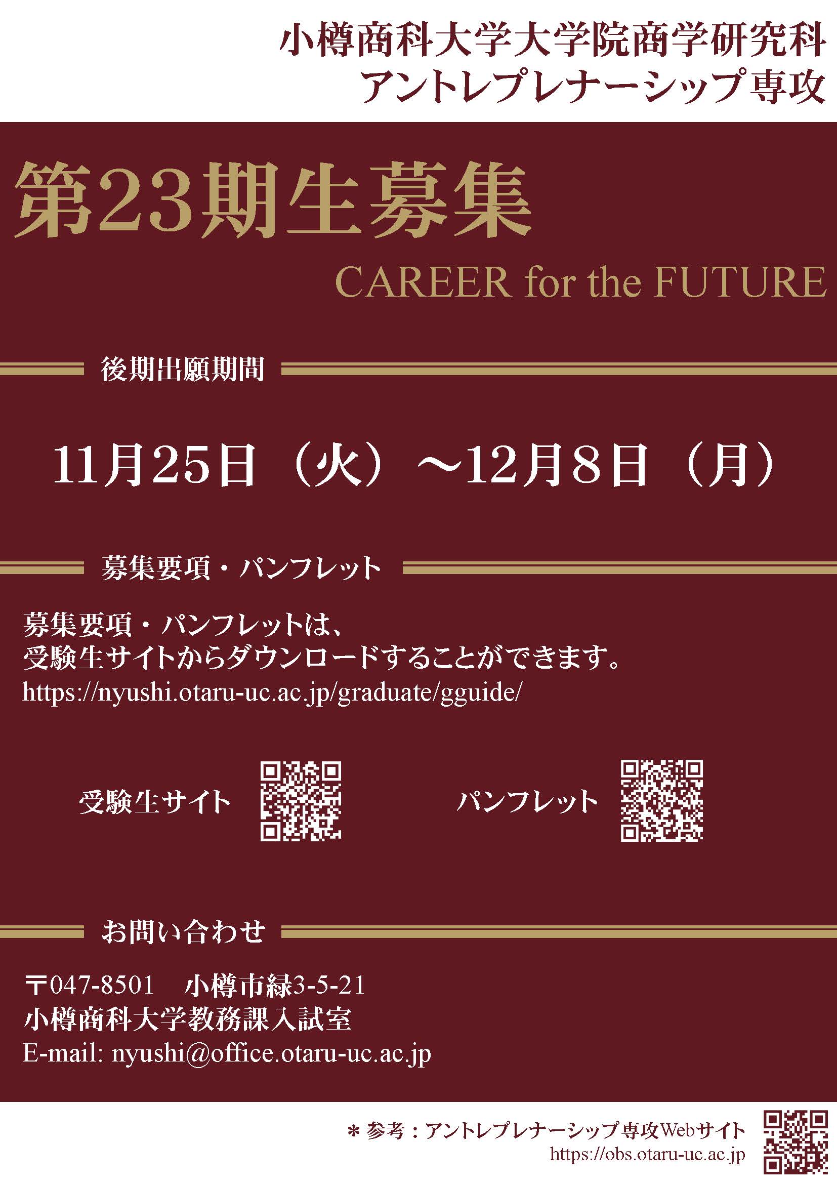 2026年度大学院商学研究科アントレプレナーシップ専攻後期入試の出願期間は次のとおりです。 出願期間 2025年11月25日(火)~12月8日(月)(必着) ※窓口受付時間… 8:30~17:15(12:00~13:00及び土日祝日を除く) 試験日 2026年2月1日(日)